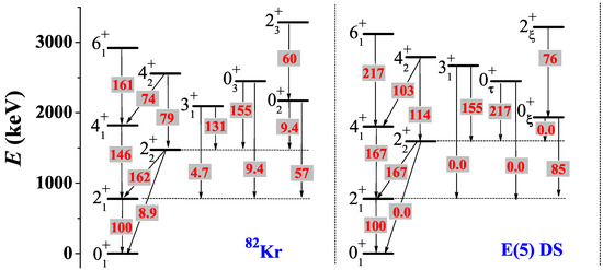 In experiments, Kr can be taken as an example of the E(5) DS, as this nucleus was very recently suggested to be a candidate of the E(5) CPS for the U(5)-SO(6) shape phase transition [60]. In Figure 3, the low-lying level pattern of Kr is shown to compare with the results solved from the Hamiltonian (64). For the transitions, the transitional operator in theory is chosen as with the effective charge e being determined by fitting the data for . Notably, the relative strength of transitions are only determined by the types of symmetry [2], which means that the ratios in the E(5) DS should be independent of the parameters in the Hamiltonian. This point was confirmed in the concretely numerical calculations [15,16]. One can find from Figure 3 that the experimental data for Kr are in good agreement with the results solved from the E(5) DS Hamiltonian (64) for both the level energies and the structure. Besides those in the family, the states in the family, and , are also well reproduced by the theoretical calculations. A small deviation from the experiments may be the state, to which the related transitions are accurately predicted but the excitation energy is overestimated in theory by about 0.5 MeV. It should be noted that the original E(5) CPS results including nearly the same structures as that shown in Figure 3 can be also applied to compare with the experimental data [60]. However, no energy degeneracy appearing in experiments indicates that the SO(5) symmetry is evidently broken in this nucleus. Removing the energy degeneracies in the E(5) mode can be naturally realized by the present Hamiltonian (64). The results confirm that the the low-lying dynamics in Kr are indeed dominated by the E(5) DS [60].
