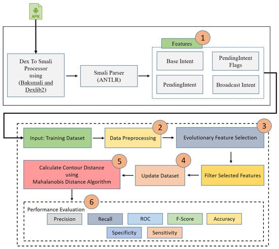 However, in order to automate the analysis, in MULBER, rather than identifying the key features manually, we follow an evolutionary feature selection method to identify the best-fit features that can be used to train our underlying machine learning model. MULBER extracts the features directly from the Android dex code. The smali/baksmali [42,43] is an assembler/disassembler for the dex format used by Dalvik, Android’s Java VM implementation, using Dexlib2 [44]. The process of extracting the PendingIntent and the Intent communication patterns as features from the APK dex code is given in Algorithm 1.