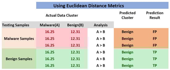 The Euclidean distance (Equation (9)) from the centroid of the benign cluster to point A is given by d1, and the Euclidean distance from the centroid of the malware cluster to point A is given by d2 (given in Equation (12)). The Euclidean distance (d2) from the malware is higher compared to the Euclidean distance from the benign cluster, calculated using the above Equation (11). Figure 4 displays the results for six sample records; three were taken from each of the malware and benign datasets at random and tested for Euclidean distance. The results show that only 50% of the prediction was correct (i.e., the malware dataset samples were wrongly mapped to the benign cluster).