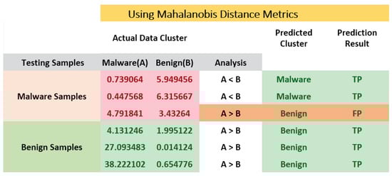However, we can see that the Euclidean distance assumes the data are isotropically Gaussian, where the covariance matrix is assumed to be its identity. Thus, Euclidean distance treats all the given features equally. On the other hand, the Mahalanobis distance metric assumes the data are an anisotropic Gaussian distribution, whereby it measures the correlation between the variables. Figure 5 displays the results for six sample records; three were taken from each of the malware and benign datasets at random and tested for the Mahalanobis distance. The results show that 100% of the prediction was correct. For example, calculating the Mahalanobis distance for the first sample test record from the malware dataset, we can see that the distance from malware was 0.739, which is less than the Mahalanobis distance taken from the benign cluster (i.e., 5.95). Thus, we can classify the new data as malware. On the other hand, malware sample record 3 was misclassified as benign.