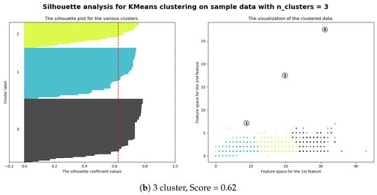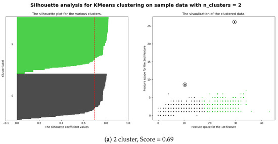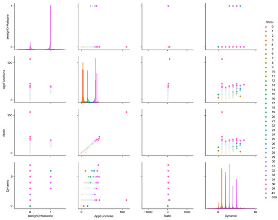 Following the Hopkins statistics, MULBER identified the number of possible clusters that can be formed from the generated dataset using the silhouette coefficient. The silhouette coefficient value was between [−1, 1], where a score of 1 was the best value and represented very compact data points within the cluster, −1 represented the worst value, and when the value was close to 0, it denoted overlapping clusters. Our silhouette analysis for the number of clusters that can be formed is given in Figure 7. Based on the silhouette coefficient value, we can say that by using n_cluster = 2, we could obtain points that were closer within the cluster and further away from the other cluster points. Figure 8 shows the distribution and the relationships between the variables from the perspective of the static features of the application.