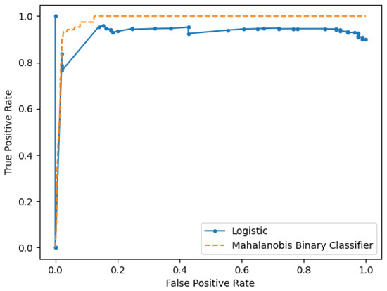 AUC-ROC curve comparing the Mahalanobis binary classifiers.