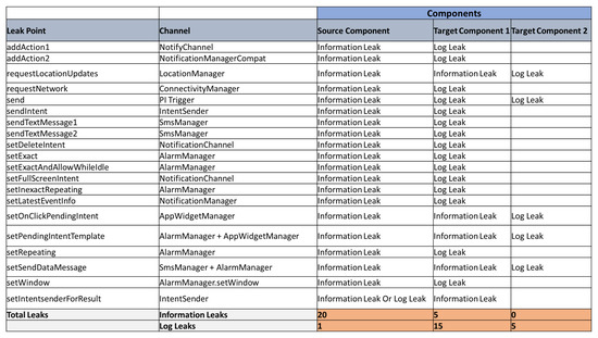 - Li, L.; Bartel, A.; Bissyandé, T.F.; Klein, J.; Le Traon, Y.; Arzt, S.; Rasthofer, S.; Bodden, E.; Octeau, D.; McDaniel, P. Iccta: Detecting inter-component privacy leaks in android apps. In Proceedings of the 2015 IEEE/ACM 37th IEEE International Conference on Software Engineering, Florence, Italy, 16–24 May 2015; Volume 1, pp. 280–291. [Google Scholar]