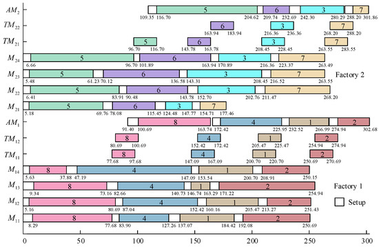 Table 1 shows an example with 2 factories, 8 jobs and 4 components of each. , , data on energy consumption and transportation are shown in Section 5. A schedule of the example is shown in Figure 1. In this Figure, take job as an example, 8 on denotes the k-th component of , 8 on denotes the movement of components by , 8 on indicates that is assembled on . , , , so , , , , as a result, .
