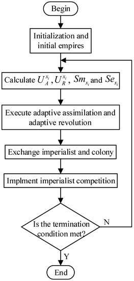 Assimilation is often executed by making each colony move toward its imperialist, and the movement is implemented by global search operator between colony and its imperialist [40,47]. In this study, an adaptive assimilation is proposed, in which assimilation probability of is computed by