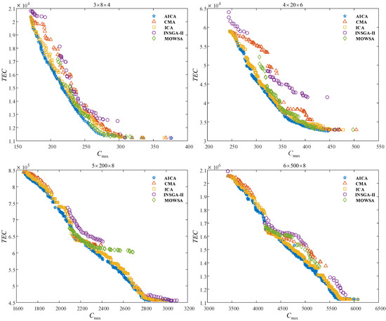 - , if , go to step (2); otherwise, stop the assimilation.Where is obtained by sorting all solutions in P in the ascending order of makespan and is computed by sorting all solutions in the ascending order of . Archive is used to store non-dominated solutions produced by AICA.