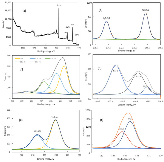 XPS analysis showing full scan spectra (a) and core levels Ag3d (b), C1s (c), N1S (d), Cl2p (e) and O1s (f) spectra.