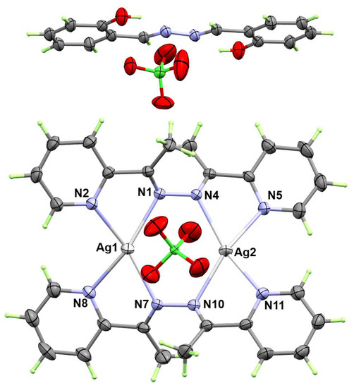 The structure of the [Ag(La)]2(ClO4)2.1/2(Lb) complex revealed, without a doubt, the Ag(I)-mediated hydrolysis of the Schiff base hydrazone ligand (L). In this case, the Ag(I)-azine based complex with the co-crystallized Lb molecule is crystallized in the lower symmetry monoclinic crystal system compared to the [Ag(La)]2(ClO4)2 without the co-crystallized Lb [40]. In the former, the unit cell parameters are a = 15.6034(11), b = 14.9707(12), c = 17.3993(12) Å and β = 110.554(3) while Z = 4. In this case, the asymmetric unit comprised one of the dinuclear formula [Ag(La)]2(ClO4)2 and half of the azine (Lb) as a co-crystallized molecule (Figure 3). In the crystal structure of the [Ag(La)]2(ClO4)2.1/2(Lb) complex, the two hydrolysis products La and Lb were trapped, which confirms the Ag(I)-mediated hydrolysis of L to the corresponding azines. The Ag(I) is found to be coordinated with the two molecules of the azine La which act as a bridged bidentate chelate connecting the two Ag(I) sites. The second azine Lb is found to be freely uncoordinated with Ag(I) and co-crystallized with the [Ag(La)]2(ClO4)2 molecule. In addition, the azine Lb was found to be stabilized by a strong intramolecular O-H…N hydrogen bond, which could be the main reason for this fragment being freely uncoordinated. The Ag-N(azine) bonds are slightly longer than the Ag-N(pyridine) ones (Table 3). The shortest Ag-N(azine) and Ag-N(pyridine) bonds are Ag1-N7 (2.383(5) Å) and Ag1-N2 (2.358(5) Å), respectively. The largest angles between the trans Ag-N bonds are the N5-Ag2-N10 (157.77(16)) and N2-Ag1-N7 (155.48(17)). The bite angles of the azine ligand La are in the range of 70.22(17) (N11-Ag2-N10) to 70.82(15) (N5-Ag2-N4). Hence, the Ag(I) is tetra-coordinated and has a distorted square planar coordination environment with almost equidistant diagonals, where the two diagonals are deviated significantly from perpendicularity as a consequence of the geometric preferences of the donor atoms in the bidentate chelate. The perchlorate anions are found to be freely uncoordinated, as indicated by the significantly long Ag…O distances (Ag1…O6: 3.163, Ag2…O7: 3.165 Å, Ag2…O9: 3.197 Å). These results agreed very well with the X-ray structure of the [Ag(La)]2(ClO4)2 complex [40].