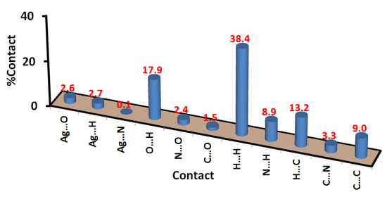 The percentages of all intermolecular contacts contributing to the molecular packing of the cationic complex are shown in Figure 6. The most dominant contacts are the H…H (38.4%) and O…H (17.9%) interactions. Other contacts, such as the H…C (13.2%), C…C (9.0%) and N…H (8.9%), also significantly contributed to the molecular packing. As can be seen from Figure 5, only the Ag…O, O…H and H…H contacts appeared as red spots in the dnorm map. The Ag1…O6 (3.163 Å), Ag2…O7 (3.165 Å) and Ag2…O9 (3.197 Å) contacts are shorter than the vdWs radii sum of Ag and O atoms, indicating strong interactions with the perchlorate ion. These distances are significantly longer compared to the covalent radii of the respective atoms, which revealed an ionic perchlorate ion. A list of the other short contacts is depicted in Table 5.