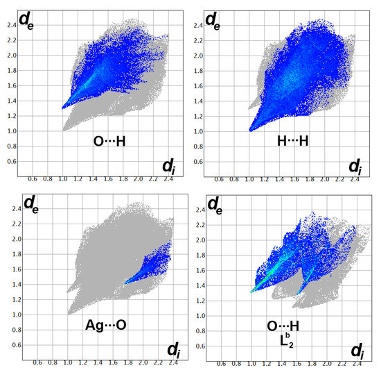 For the co-crystallized organic azine molecule Lb, the major contacts are the H…H (40.0%), O…H (32.2%) and H…C (22.8%), while the minor contributing contacts are the N…H (4.0%) and O…O (0.3%). Among these interactions, the O…H contacts are the most significant (Table 5). The significance of the Ag…O, O…H and H…H interactions are further indicated by their appearance as sharp spikes in the fingerprint plots (Figure 7).