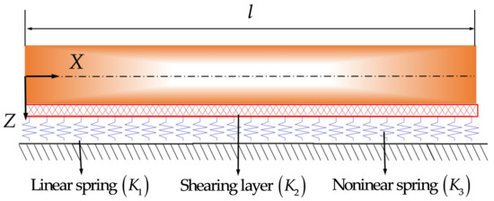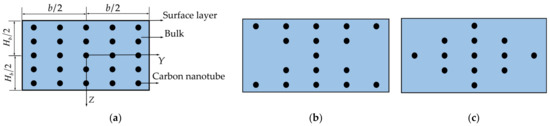 Consider an FG-CNTR nanobeam made of CNT agents and silicon (Si) matrix with length , total thickness , and width , as shown in Figure 1. The nanobeam is under the action of uniform temperature rise and is placed on tri-parameter elastic substrates. Moreover, the structure is referred to a Cartesian coordinate system . To capture the surface effect, the nanobeam is abstracted as a composite structure composed of an extremely thin surface layer and a bulk volume. Figure 2 displays the rectangular cross sections of the CNT-based nanobeams with UD, O, and X distribution patterns, respectively. The CNT volume fractions of the resultant nanobeams vary continuously as a linear function of the variable , as summarized below [49].
