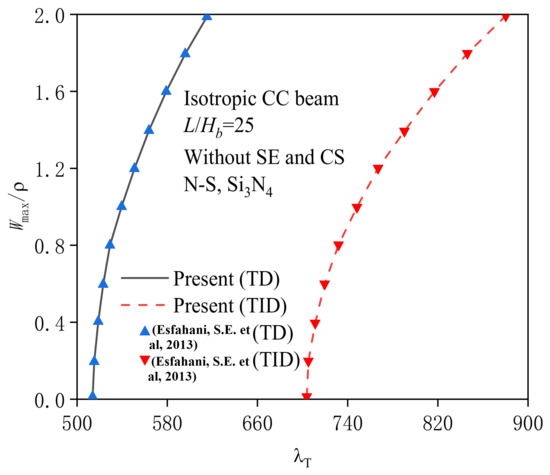 The current model can degenerate into the size-independent one by setting N/m and nm. Here, the isotropic macrobeam made of metal/ceramic phases is selected, and effective material properties can be found in Ref. [54]. Table 1 and Table 2 compare the results of the critical buckling temperature quantity for a macrobeam under various boundary conditions with results in previous works. Table 1 shows that the present results are larger than the available ones in [54]. The differences between the two are attributed to the fact that the existing theoretical model is based on the Reddy’s higher-order shear deformation theory, while our model is based on the Euler–Bernoulli beam theory. The introduction of shear deformation effect will weaken the structural bending rigidity. Moreover, the bending moment is assumed as a function of coordinates in Ref. [54], which is actually unreasonable. In Table 2, one can observe that the present results and the reported ones in Ref. [55] have a good consistency. To provide a consistent comparison with previous works, Figure 3 presents the thermal postbuckling equilibrium path of a CC macrobeam with TD and TID cases, where denotes the radius of gyration. As expected, the results in this paper are consistent with those in the literature.
