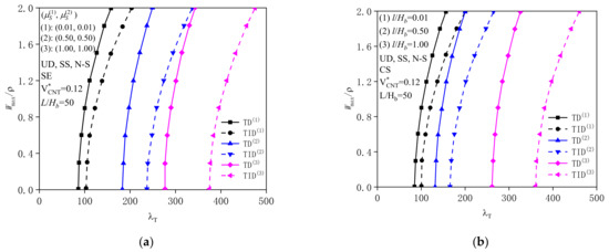 In what follows, the temperature-dependent (TD) case, belongs to the conditions when composite properties are calculated at current temperature, while the temperature independent (TID), on the other hand, refers to the case when properties are evaluated at 300 . As presented in Equations (39), (40) and (41), the and of the Si matrix decrease as the temperature rises, while is just the opposite. For the CNT reinforcements in Equations (42), (43) and (44), the and decrease as the temperature rises. Then, the critical buckling load of the TID case is higher than that of the TD one. For the TD case, the thermal buckling load should be obtained for each temperature load step by the incremental method. In the first step, we calculate the material property parameters at the reference temperature and obtain the trial solution of the thermal buckling load according to Equations (32) or (38). In the second step, we calculate the material property parameters at and obtain the trial solution of the thermal buckling load according to Equations (32) or (38). Then, follow the above steps until .