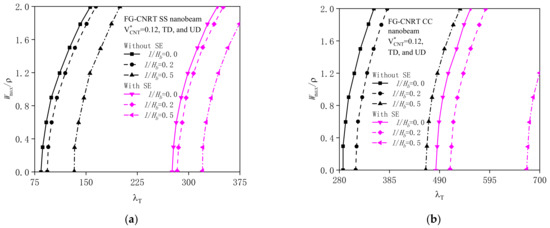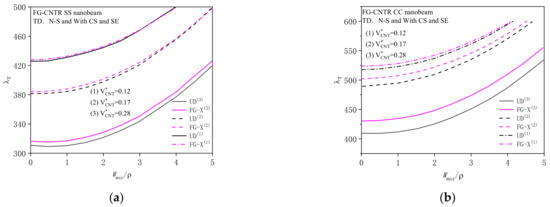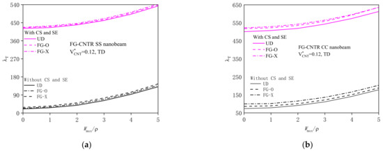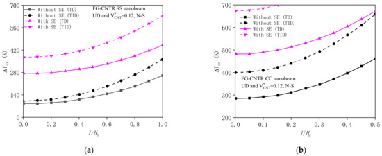 Figure 5 exhibits the SE and CE effects on the critical buckling load of a UD nanobeam with . Clearly, the SE and CS make positive contributions to increasing the buckling load , which means small-scale effects may exert a considerable rigidity and make nanobeams harder to deform. These contributions are more prominent, especially when the is large. However, the TD case exhibits a negative impact on the buckling temperature when compared with those of the TID case, and this phenomenon is more remarkable when considering the SE effect.