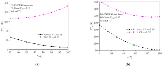 In Figure 7, the effects of aspect ratio on the buckling load are depicted. It is again observed that the maximum buckling temperature is associated with SE-CS analysis, while the minimum is associated with classical elasticity analysis. Additionally, for classical results, the buckling temperature decrease with increasing the ratio , which is due to the reduced total stiffness of the structure. However, as predicted from Figure 7a for the size-dependent nanobeam with SS ends, the critical buckling temperature enhances as the ratio increases, and as the ratio increases, the SE and CE effects gradually become significant.