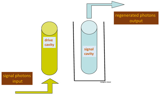 The experimental setup on the Yale University campus. Microwave photons from the signal generator are directed into the copper resonant cavity (drive cavity) as shown. No incident photons pass through the walls of the drive cavity. An identical copper cavity (the signal cavity) sits inside the liquid helium cooled cryogenic Dewar separated from the drive cavity.