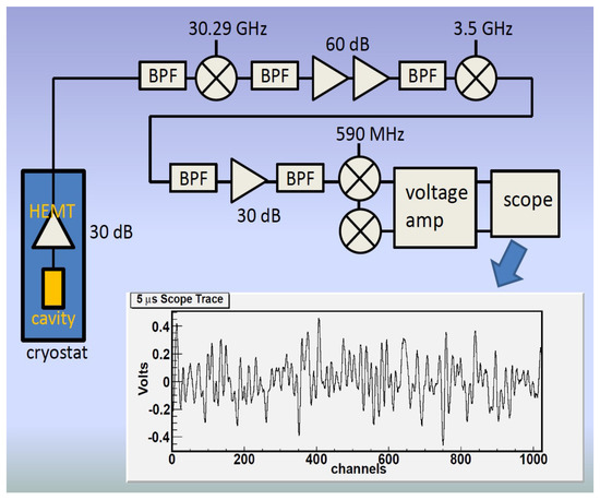 A schematic of the experimental setup on the Yale University campus. The copper cavity is held at cryogenic temperature (4 K liquid helium) inside a seven Tesla magnetic field. The signal from the cavity, resonant at 34 GHz, is fed into a HEMT, the LNA, who’s output feeds into the sensitive receiver chain shown. The latter uses a triple heterodyne technique to translate the 34 GHz signal down to the audio range, suitable for acquisition and storage, and later analysis.