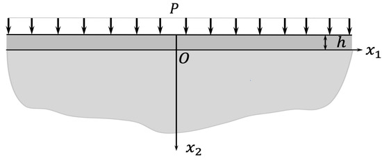 Thus, the present study considers a coated elastic half-space that is subject to certain external forces, including the magnetic field force, and the normal mechanical load P acting along the surface of the coating layer. Here, both the coating and the half-space layers are assumed to be homogeneous, and are further supposed to be made of isotropic material. Moreover, the entire structure is then recognized to be an inhomogeneous structure in relation to the varying material properties in the layers. Additionally, the coating layer is presumed to have a constant thickness of h that occupies the interval , while the half-space layer is perfectly interfaced over the semi-infinite interval In addition, this scenario is illustrated in Figure 1.