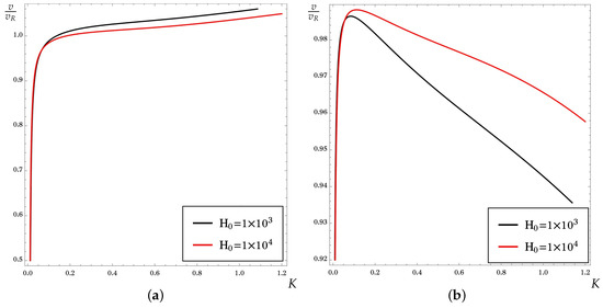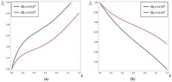 Dependence of the scaled phase velocity on the dimensionless wavenumber K with . (a) Iron coating and zinc substrate. (b) Zinc coating and iron substrate.
