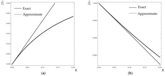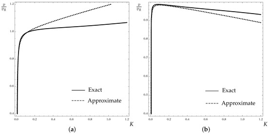 Comparison of the exact (22) and approximate (45) secular equations via the dependence of scaled velocity on the dimensionless wavenumber K with (a) Iron coating and zinc substrate. (b) Zinc coating and iron substrate.