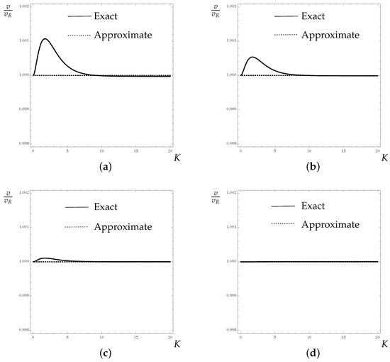 The relationships between versus K when the relation (46) is achieved. (a) if , then . (b) if , then . (c) if , then . (d) if , then .