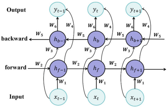 The internal structure of the BiLSTM is illustrated in Figure 2. The output, hf, was calculated for each time step, ti(i=1,2,...,n), from the forward layer, and the output, hf, was calculated using Equation (4). The backward calculation was performed in the backward layer, and the output, hb, was calculated using Equation (5); then, the final output, yt, of the BiLSTM was obtained by connecting the outputs of the forward and backward layers, which is calculated as in Equation (6).