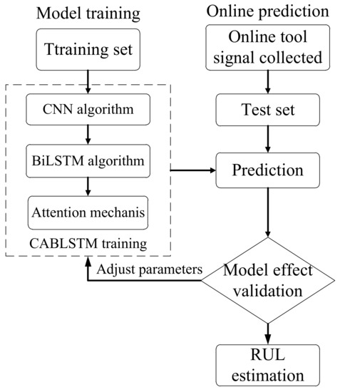In this study, we propose a prediction method based on CNN-BiLSTM with an attention mechanism, and the flowchart of the proposed CABLSTM-predicting algorithm is shown in Figure 3, which can be generally divided into two parts: offline training and online prediction [1,37,39]. During offline training, multidimensional signals are collected for different tool wear, and the raw signal data were preprocessed with wavelet noise reduction, normalization, etc. The monitoring data with the corresponding wear quantities were constructed as the training data and used as the input to the CABLSTM network model. The structure of the CNN autonomously extracted tool degradation features, the BiLSTM extracted temporal information from the data, and the attention mechanism focused on important degradation feature information. The network allows for the autonomous and effective extraction of tool degradation features and RUL prediction.In online tool RUL prediction, for a new tool to be tested in cutting conditions, the same multidimensional signals are collected by multiple sensors as in offline training, pre-processed with the same data, and input into the trained model to predict the tool RUL online in real time.