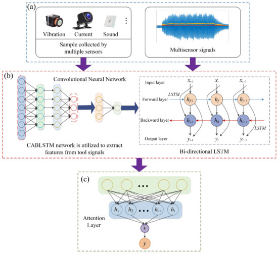 The detailed steps of the CABLSTM structure areshown in Figure 4. (a) In the training part of the model, the data was prepared. For the signals collected by multiple sensors, invalid samples were eliminated, available data were selected, and pre-processing, such as denoising and normalization, was performed on the data. The sample time series of set length was intercepted as the training sample sequences, corresponding wear values were obtained as training labels, which with training samples were constructed as training data. (b) In the model building part, CNN can extract deep information in the tool time series through its powerful data mining and feature mapping capabilities and autonomously extract minor degradation features of the multi-dimensional sensor signals of the tool. BiLSTM can extract more comprehensive feature information by learning information from past and future moments and obtain the output of each time step, solving problems, such as long-term dependence of time series and gradient explosion. (c) The attention layer can perform further information screening on features, assign different weights to intermediate features that have a significant impact on the predicted outcome, selectively learn features from the model-training process, filter useless information, and selectively learn key information, which can improve the accuracy of the model prediction. The fullyconnected layer can reduce the dimensionality of the data and map the information to the predicted values, thereby completing the process of autonomous extraction of features to the prediction of wear values. Finally, the test sample data was constructed and fed into the trained network model to achieve wear value prediction for the target tool.