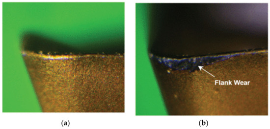 Generally, tool wear includes two forms: flank wear(VB) and crater wear(KB) [43].Currently, most researchers focus on flank wear monitoring in studies on the prediction of tool RUL, as flank wear is an influential factor in the quality, reliability, and dimensional accuracy of workpiece machining [44]. Figure 5 shows an unworn insert and a worn-out cutting worn insert. In this experiment, the flank wear VB was applied as a generallyaccepted parameter for tool wear estimate.