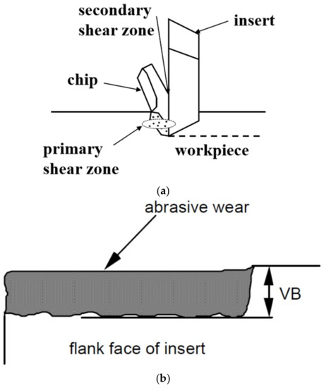 Tool workpiece contact and tool wear: (a) shear zones at tool/workpiece interface; (b) tool wear VB [45].