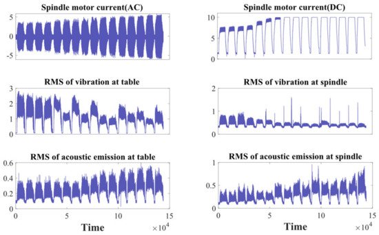 The amount of signal data collected during actual monitoring and the susceptibility of the acquisition process to environmental influences requires data pre-processing. As the average life cycle is shorter when testing with stainless steel than with cast iron, it is required to predict the tool life using two different life prediction models depending on the material [46,47]. Figure 7 shows a visual image of the six sensor acquisition signals(AC spindle motor current, DC spindle motor current, RMS of vibration at spindle and table, RMS of acoustic emission at spindle and table) for tool 1 (17 runs). As shown in the figure, each run of the tool involves the processes of tool entry and exit; the process is not meant for monitoring the life conditions of the tool, and there are distinct unstable regions in the process. Therefore, in this study, only the intermediate stable regions during each run from 3000 to 7000 (containing 4000 values) of the acquired signals were used to train the CABLSTM model.