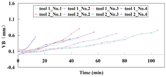 According to the ISO3685-1977 standard, the tool wear was defined as the flank wear width VB [40]. Additionally, according to the relevant literature, the tool RUL was considered terminated when the rear face wear value, VB, of the toolexceeds VBmax = 0.45 mm. Therefore, this study used the CABLSTM model to predict the current wear value, VB, of the tool, and then, the remaining useful life state parameter RUL of the tool was calculated using Equation (12)