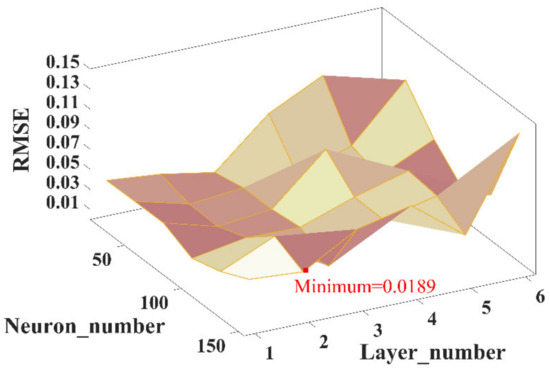Determining the parameters of the CABLSTM model is crucial for constructing the prognostic model of the milling cutter. Therefore, the model parameters, such as the number of neurons, number of network layers, and dropout rate, should be accurately determined. In this study, we defined the number of network layers as 1–6, and the number of neurons per layer of the network was set at 50–300. The training results of the model with different layers of the network and number of neurons were calculated, as shown in Figure 9, to obtain the optimal parameters of the model, which has the smallest root mean squared error (RMSE) when the number of neurons per layer is 250 and the number of network layers is 3.