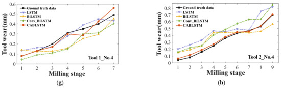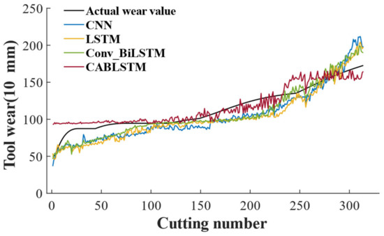 Figure 11 and Figure 12 show that the RUL prediction errors of LSTM, BiLSTM, and Conv_BiLSTM are higher than CABLSTM. In addition,Table 3 shows that the CABLSTM method is superior to the other methods in terms of the three performance indicators. It is well known that the output of neurons in RNN may directly influence itself in the following period, namely “gradient disappearance” [55]. Additionally, LSTM can neither encode the information from the back to the front nor use the future information [56]. The BiLSTM network often has too many degrees of freedom, which will result in overfitting. Therefore, these methods are not suited for tool RUL prediction. The proposed CABLSTM can reduce the dimensionality of the primal sequence data by extracting the input temporal information through CNN. Due to capturing the dependencies information of both the previous and current moments, the BiLSTM network is used in CABLSTM to process time-series data. In addition,the application of the attention mechanism improves prediction accuracy because the features with different weights are considered comprehensively in different time steps. Consequently, the proposed CABLSTM can solve the above problems and improve the accuracy of tool RUL prediction.