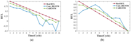 Using the tool wear values predicted by the above model to calculate its RUL, as shown in Figure 12, the tool life is considered terminated when RUL reaches 0 for the first two tool samples(Figure 12a,b). In the early stage of tool operation, the data input into the prediction model contains less information; thus, the prediction error is higher, whereas the more the tool is utilized in the later stage with more data input into the model, the model results are increasingly accurate. Figure 12 also shows a comparison between the RUL predicted by the proposed method and the Conv_BiLSTM method, and compared with the Conv_BiLSTM method, the CABLSTM method achieves an excellent prediction performance, and the predicted RUL is closer to the real RUL values.