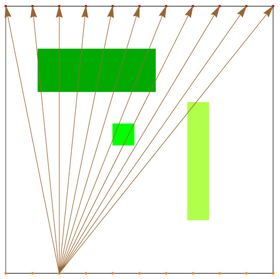 In the case of an incomplete dataset, which is represented here by the coal seam survey, projections are obtained as shown in Figure 1, where orange points indicate radiation transmitters, red—receivers, brown arrows indicate ray paths and directions, and green rectangles—objects to be detected. We are dealing with the problem of an incomplete dataset because the obtained X-rays (projections) are “one-sided”. In medical tomography, projections are obtained from any angle (for a large number of such angles). In the examination of the coal seam, we can obtain data only on the basis of projections drawn between two opposite walls. Despite the fact that we can collect a lot of such data (e.g., as much as in medical tomography), their quality (not in the sense of the accuracy of measurements, but in the sense of the data on the interior of the examined object carried by these projections) will differ significantly from the information obtained in the tomography medical. As long as we assumed the symmetry of the grid and the distribution of transmitters and receivers of penetrating radiation, at this stage, due to the heterogeneity of the studied area, we obtain projection asymmetry, and in this case it leads to a solution.