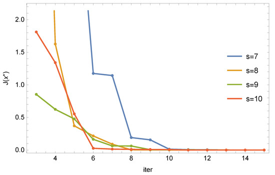 Figure 2 shows, for the ABC algorithm, the relationship between the number of iterations and the value of the objective functional (3) for different numbers of s bees.