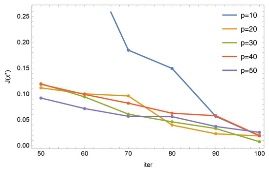 Figure 3 shows the relationship between the number of iterations and the value of the objective function (3) for different numbers of ants p for the ACO algorithm.