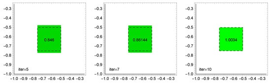 Each of the parameter sets was run 10 times and the best one was selected from the series of results. As can be seen, after 10 iterations, the reproduction errors are very small, but for 10 bees, such results are obtained from 6 iterations. For example, for 6 iterations, for 10 bees, the rectangle R was recreated as follows: , the function assumed the value , and the objective function was . For 15 iterations and 10 bees, the values were equal to: