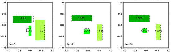 In subsequent tests, we increased the number of rectangles by one. This time we have two rectangles, and , where the density distribution function takes values equal to 1 and 2, respectively.