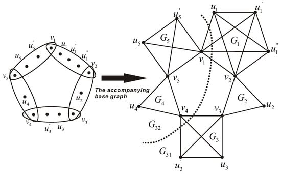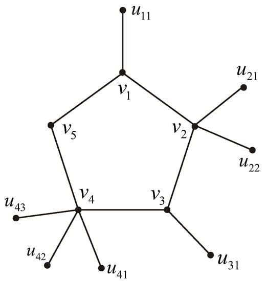 Before proving the main theorem, we introduce a special class of graphs. Let C n = v 1 v 2 v n v 1 be a cycle of length n, where n 3 . Joining each vertex v i ( i [ 1 , n ] ) of C n with a new u i i out of C n by an edge obtains a graph, called a s u n g r a p h denoted as S C n . Furthermore, for integer k i 0 ( i [ 1 , n ] ) , we join each vertex v i of C n with k i new vertices u i k i to produce a generalized sun graph, denoted by G S C n k 1 , k 2 , , k n [24]. It is reasonable to allow some k i = 0 , that is, no joining the vertex v i of C n with any new vertex. For instance, the generalized sun graph G S C 5 1 , 2 , 1 , 3 , 0 is shown in Figure 1.