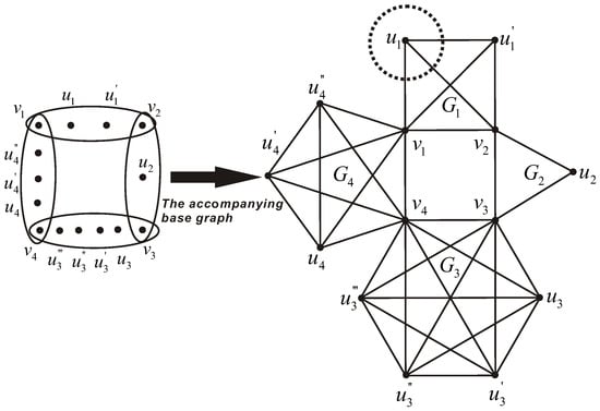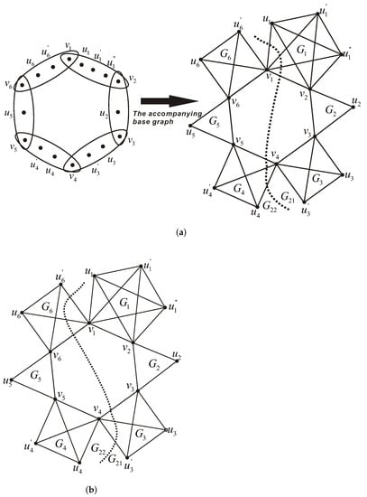 When m is even, see Figure 4a. A cut A 1 , B 1 is given, which is the vertices division of the accompanying base graph G H ( C m ) , where A 1 = V G 1 v 1 i = 2 m 2 V G i , B 1 = V V 1 . Let G 21 be the induced subgraph of the vertex in A 1 . Let G 22 be the induced subgraph of the vertex in B 1 . Take any two vertices in A 1 , such as v i G i , v j G j or v i G i , v j + 1 G j or u i G i , u j G j or u i G i , v j G j . The content is divided into the following two categories: