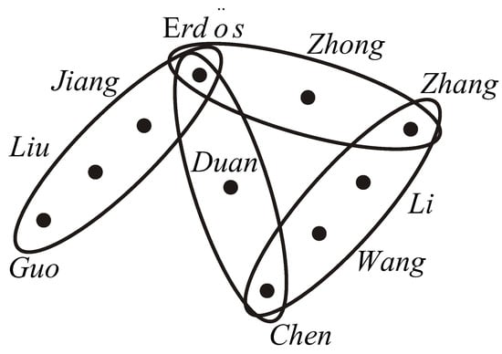 According to the inspiration of applying graph theory knowledge to real life [25,26], the hypergraph studied in this paper also has many applications. The distance-based topological indices of many molecules (such as the Wiener index, Szeged index, PI index, etc.) are closely related to their physical and chemical properties [27,28]. We already know that the distance between any two vertices in a hypercube graph is exactly equal to the number of different positions representing the array of the two vertices [29]. If a hypergraph is an l 1 -graph, we can easily get the distance between any two vertices in the hypergraph, and then we can further calculate its various indices. Here is a simple example to find the Erd o ¨ s number for any author.