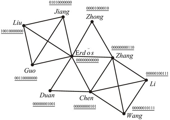 By observing the vertex labels of Chen and Erd o ¨ s, it can be found that the labels of these two vertices are different in four positions, so the distance between Chen and Erd o ¨ s in Q 11 is 2. Since this hypergraph H U 4 1 2 Q 11 , then the Erd o ¨ s number of Chen is 2 2 = 1 . According to this method, we can find the Erd o ¨ s number of any author.