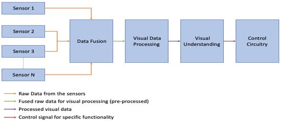 A computer vision system generally includes one or more camera sensors, software or circuitry for data processing, and a control system. The camera sensors are configured for co-operative sensing in the operating environment and gathering raw sensor data. The raw sensor data are fused to obtain pre-processed visual information that is utilized for visual processing. The visual processing includes several steps to process and furnish the sensor data and obtain a visual understanding. A control signal is generated based on the visual understanding and is transmitted to the control system. Based on the control signal received, the control system actuates one or more components of the system such that the desired functionality of the system is achieved. The abovementioned process is depicted in Figure 1.