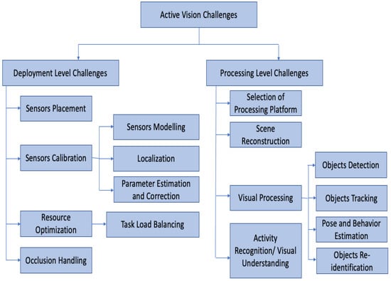 A multi-camera active vision system [] (hereinafter interchangeably referred to as an “active vision system”) is basically a computer vision system that employs an SCN with the capability of altering the viewpoints of the sensor nodes, thereby yielding better data for processing. The operation of active vision systems can be differentiated into two levels: a deployment level (i.e., for data extraction) and a processing level (i.e., where the visual processing takes place to obtain an understanding). The challenges associated with the deployment of an active vision system employing one or more SCNs can also be classified into two categories. Challenges of the first type [] are associated with reconfiguration of the sensor nodes to obtain sensor data bearing optimal information, relative to each camera’s resource limitations. Challenges of the second type [] are associated with the data-processing level of operation, occurring at the time of processing the data to develop an understanding of a scene while keeping the computational complexity as low as possible. Thus, an efficient active vision system demands efforts at both hardware and software levels of deployment. Detailed reviews of the challenges at the data-processing level and the sensor-calibration level of active vision systems are presented in [] and [], respectively. A multi-tier taxonomy of challenges for active vision systems employing camera networks on the basis of operational classification is shown in Figure 2.