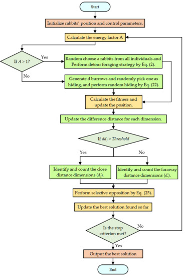 SO is a modified idea of opposition-based learning (OBL) [33]. The idea of SO is to modify the size of the rabbits far from the optimal solution by using new opposition-based learning to bring it closer to the rabbit in the optimal position. In addition, the selective opposition strategy tends to be affected by a linearly decreasing threshold. When the rabbits deploy SO, selective opposition assists the rabbits in achieving a better situation in the development phase by changing the proximity dimension of different rabbits [37]. The updates are as follows.