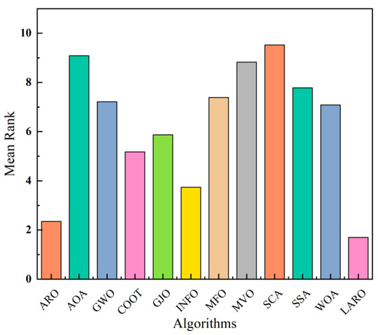 Hybrid optimization algorithms are widely used in practical engineering due to targeted improvements to the original algorithm that enhance the different performances of the algorithm. For example, Liu proposed a new hybrid algorithm that combines particle swarm optimization and single layer neural network to achieve the complementary advantages of both and successfully implemented in wavefront shaping [34]. Islam effectively solves the clustered vehicle routing problem by combining particle swarm optimization (PSO) and variable neighborhood search (VNS), fusing the diversity of solutions in PSO and bringing solutions to local optima in VNS [35]. Devarapalli proposed a hybrid modified grey wolf optimization–sine cosine algorithm that effectively solves the power system stabilizer parameter tuning in a multimachine power system [36]. To mitigate the poor accuracy and ease of falling into local solutions of the original ARO algorithm, we propose a hybrid, improved LARO algorithm by introducing a Lévy flight strategy and selective opposition in the ARO algorithm and applying the proposed algorithm to engineering optimization problems. Among them, Lévy flight is employed to boost the algorithm’s accuracy. The selective opposition strategy helps the algorithm jump out of local solutions.