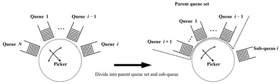 To reveal the difference between symmetric and asymmetric polling-based order picking systems, there is a specific example. Consider that polling systems usually include three processes, queue arrival, serving queue, and switching service object [], which are determined by three stochastic properties, the queue arrival rate (λ), queue service time (β), and queue service switch time (γ). In the case of N queues, symmetric polling theory assumes that λ1 = λ2 = … = λn, β1 = β2 = … = βn, and γ1 = γ2 = … = γn. For example, due to the different sizes and sales, retailers choose different order intervals to maintain their inventory levels, and the order interval directly affects the order queue arrival rate, λ. Therefore, the assumption that λ1 = λ2 = … = λn is invalid, and in a real situation, the stochastic characteristics of all order queues are variable. At the very least, not every order queue is the same, which is the assumption of asymmetric polling theory [,]. The difference between symmetric and asymmetric polling systems is the stochastic properties constraint of order queues. The asymmetric polling system loosens the constraints on the stochastic properties compared to the symmetric polling system, which is closer to the practical production requirements.