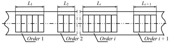 (1) The picking machines combine the unit materials into different orders according to the priority and requirements of the orders. The arrival rate, picking time, and service switching time of the orders on the same order queue have certain distributions, and the service switching time determines the distance between the adjacent orders. Each order has only one layer, and we thus only consider its area. The area is determined by the number of standardized smallest unit materials, which can be seen as the order requirements, as shown in Figure 2.